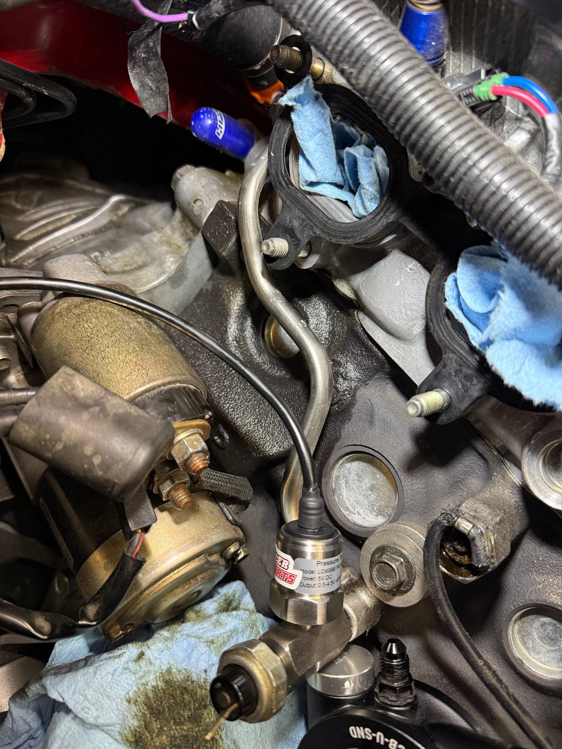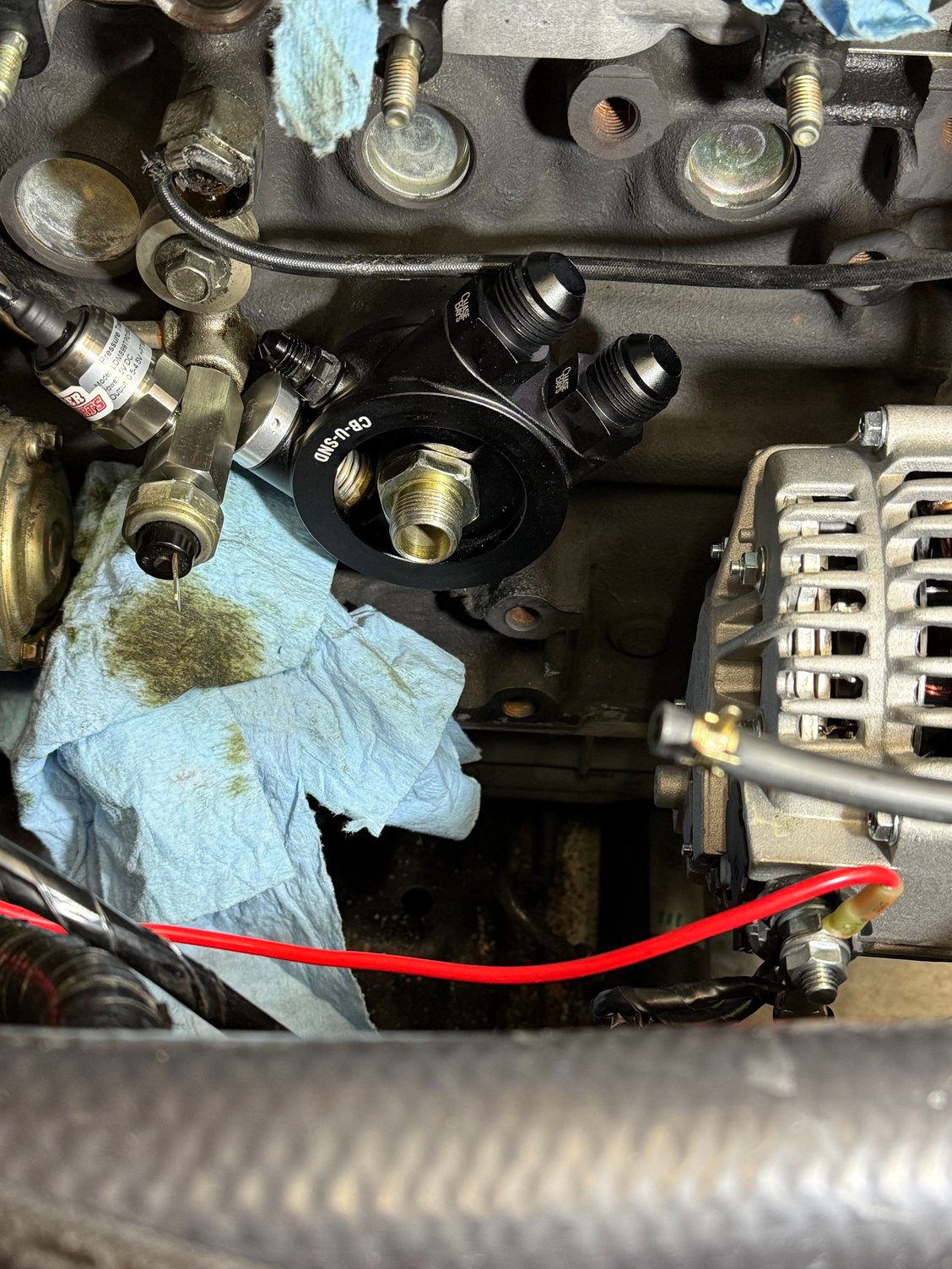 Issues I see already... I don't think I can run my turbo oil feed line off the sandwich plate since I don't think oil would flow through there until it reaches 180*. But I can't fit the sensor in that NPT port and I can't spin the sandwich plate since the AN bungs contact the alternator or the block castings below it. Maybe I can clearance those protrusions on the block below the plate. Or I need to find another oil feed location. **EDIT** There is another NPT port on the other side so I'll put my sensor there and run the turbo feed from the T with the stock sender.