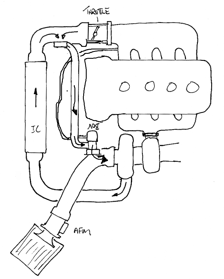there's no difference between that and how he has it plumped (besides the in/out port being used on the BOV [which itself hardly matters--people reverse those valves all the time]).