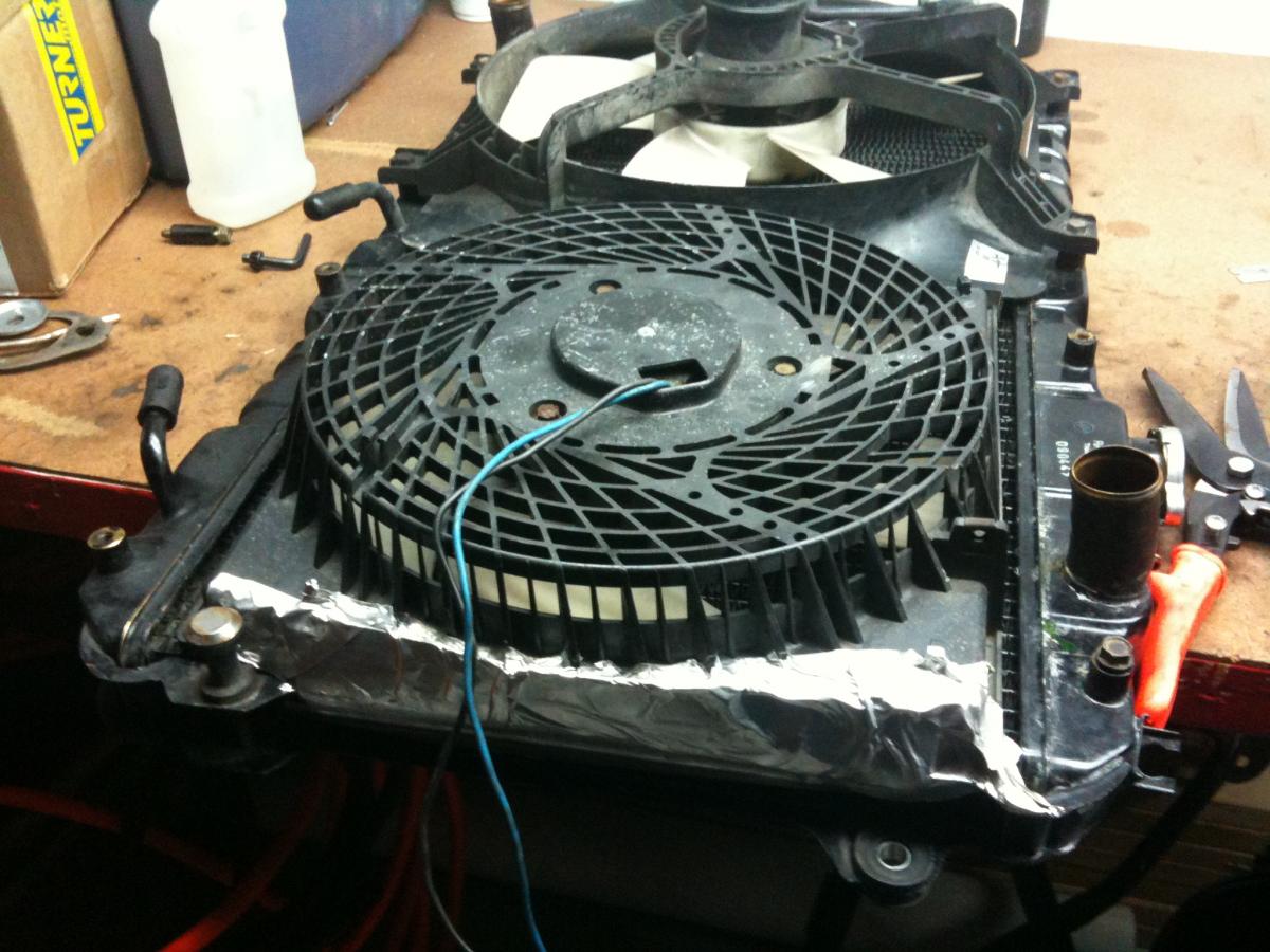 I powered the fan up next to the stock drivers side fan and holy crap, it's like a tornado compared to the stock fan. Should work quite well I think. And it was free.