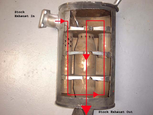 EVO muffler cutaway: Flapper is in the upper left. The arrows show the flow while flapper is closed. When it opens it bypasses the circuitous route.