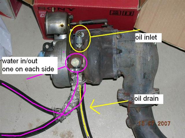 The other two ports on either side of the turbo are for water in/out. That particular fitting is a simple banjo barb with a hose attached via a hose clamp, like so: