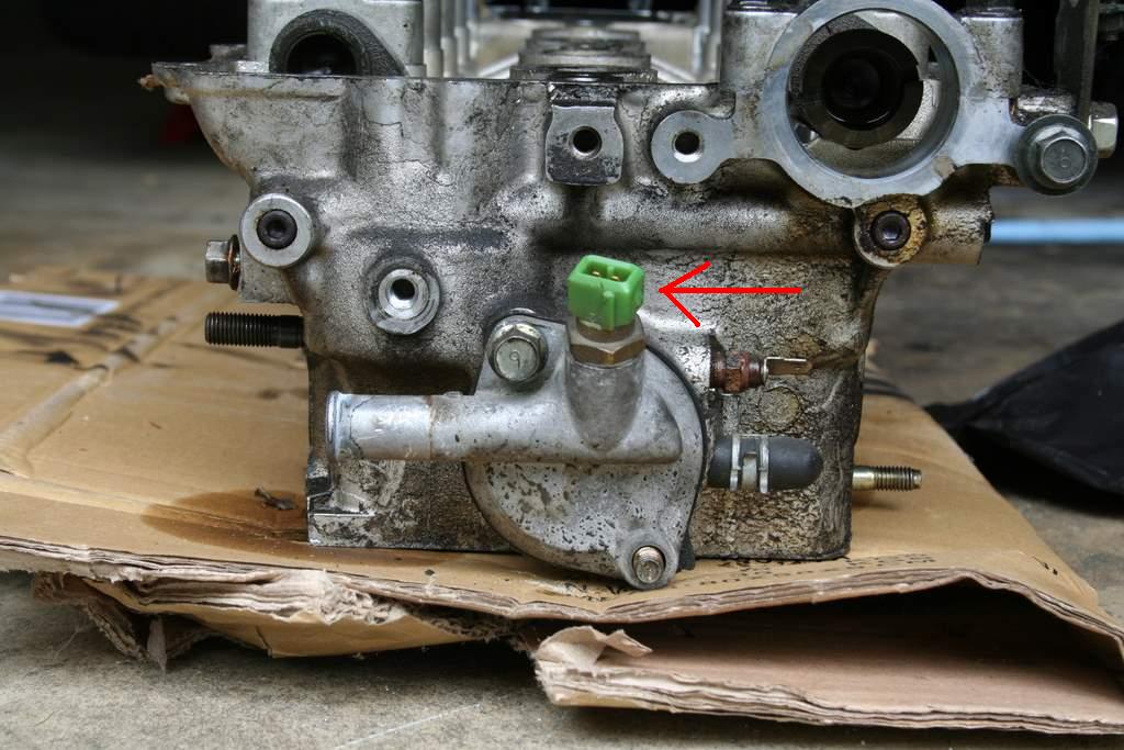 There are three thermosensors in the miata. One on top of the thermostat housing for the fans, one small spade connector at the back of the head for the dash gauge, and one green connector on the back of the head that feeds the ECU. Make sure it is the green one in the attached pic.