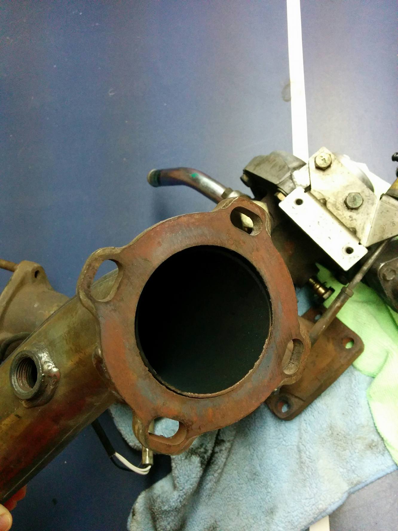 As the title suggests; I bought a custom made 2.5" straight pipe exhaust system with a flex pipe connecting to a downpipe. The PO said that the flange in the photo (downpipe) was connected to an elbow that led to the turbo.