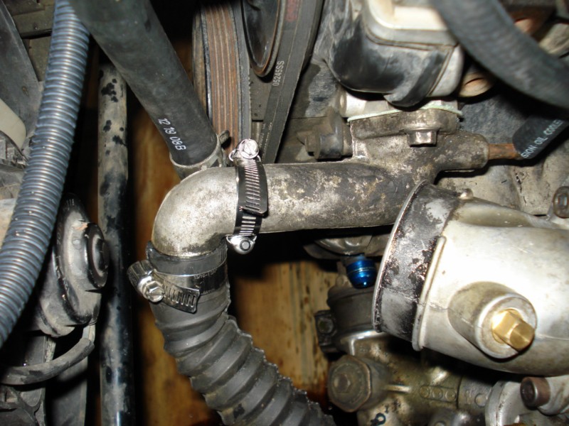 Well, at Nubbin's request I charged the battery for my Sony digicam. So the following pics should be much higher quality. I mounted the Tial and fabbed the remainder of the DP. I also rerouted the heater return so that it is no longer in the way, or any issue. I am using the stock pipe with oring and just chopped it off after 90deg. I welded on a little tab and I'm holding it on with a worm clamp. The tab will keep the hose from pushing out under pressure.
