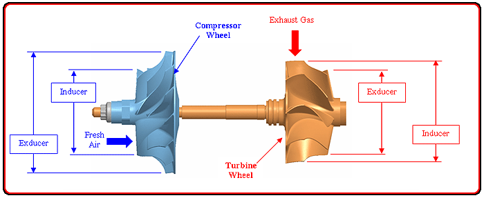 On a standard turbine there is a radius between the inducer and exducer as the flow of exhaust is inserted from the vertical and exits on the horizontal.