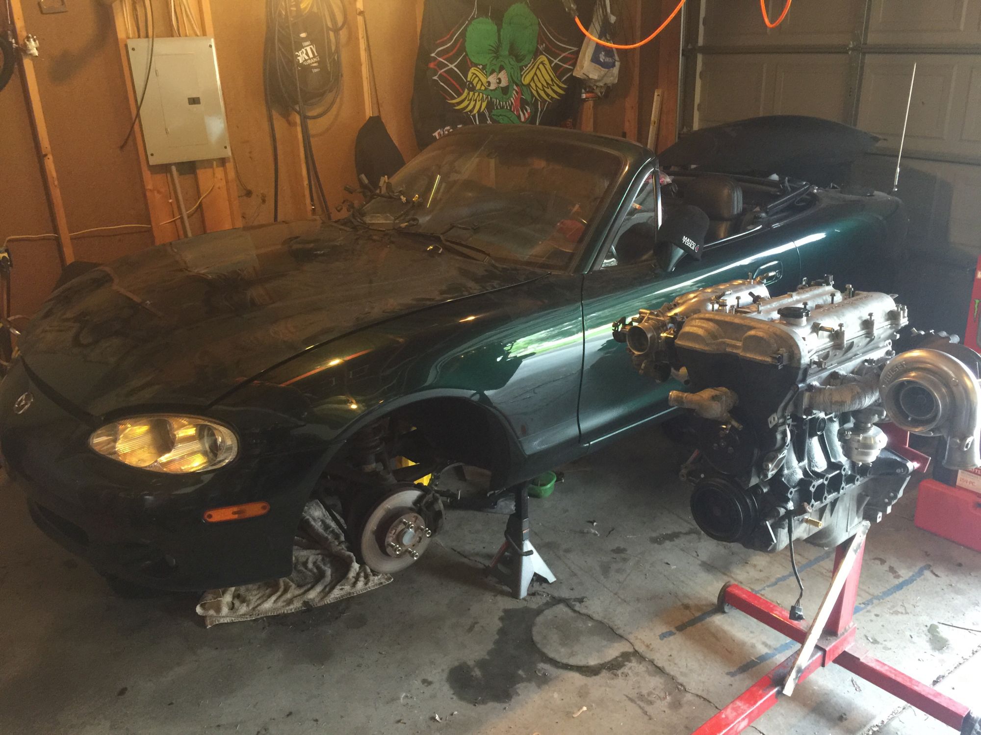 Haha well still waiting on funds for pistons rods and mega squirt. I managed to get an rx7 TII trans, t3 mani, tial waste gate and the flywheel clutch setup for 500$ and i wasnt gonna pass that up! Waste gate hasnt been used. Alone there 300$ im ln the process of basically stripping the car down right now, havent decided on clutch but being im not 100% how well the rx7 trans will adapt up clutching wise. The guy gave me the adapter plate so id rather bolt it up and work out any clutching kinks with a 50$ chines clutch then a 600$ one.... Just my thought but thats why i chimed in! I havent built a miata and you guys have so you guys know more then me! As far as miata wise! So good or bad i value your guys input!