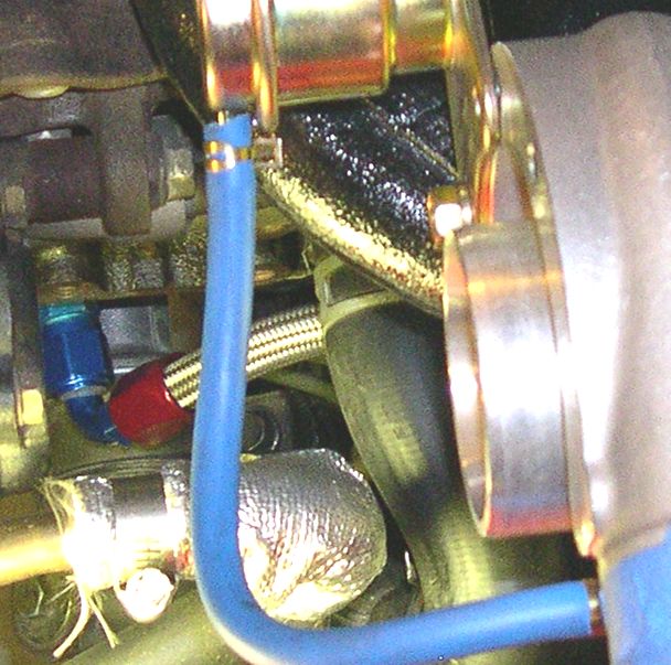 You'll note how the hose is sort of formed to fit in a curvy way. I did this by making it slightly over-long, and when attaching the last fitting (the -8 straight end to the turbo side) I pre-tensioned the whole thing in this twist by holding a wrench on the red part of the fitting while I tightened down the blue part. It clears the coolant and steering lines nicely, and isn't really free to flop around on its own.