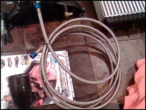 What size is the steel braided line you have? I'd put on end on, figure out what length you need. Then take it to the shop have them cut it and put a new end on it as your feed. If you need a restrictor use a 1/8" aluminum poprivet between two AN fittings, make sure it's aluminum.