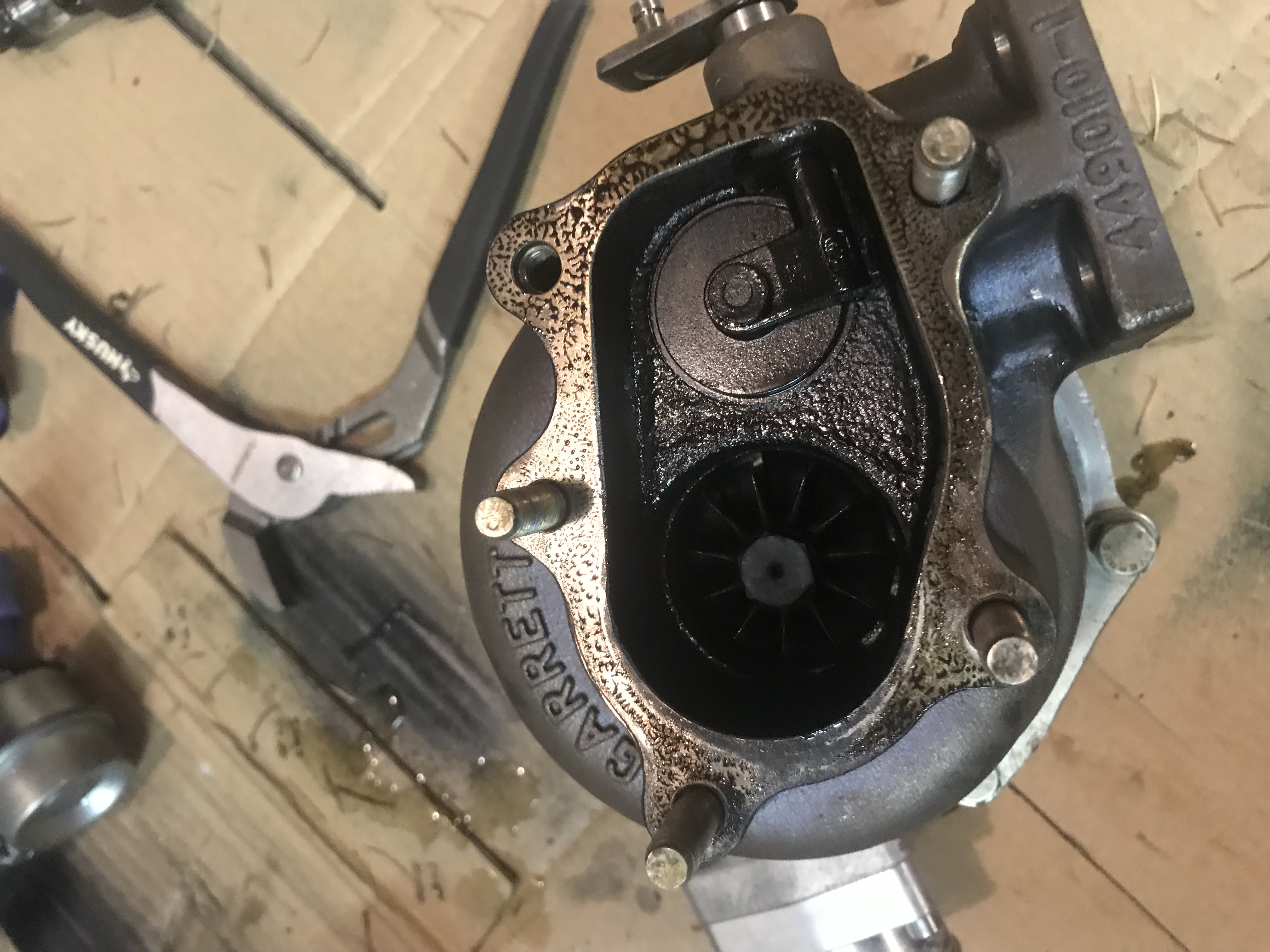 So I purchased a 2560r which had previously been rebuilt by JDS performance and upgraded to their billet wheel, bought it frshly rebuilt (had sat in shipping packaging for a while but never assembled. Anyway, I put it on my car to replace the begi t25/28 hybrid, with a .035" restrictor from ATP, to attach my -3an line off an oil filter sandwich. The car started up, but it was smoking. I figured I would let it heat cycle a little so I drove for just a few minutes, made everything was up to temp, turned the car off and came back the next day, smoke was still pretty gnarly. I decided to separate the top and bottom parts of my fm downpipe and saw a decent amount of oil so I pulled the turbo off to inspect. Well these photos are what I have found. I sent the turbo back out to JDS and Josh inspected it and said everything is good but it looks like the comp wheel was contacting the inside of my housing slightly and that he suspects their is too much pressure being ran through the turbo, I guess it looked like the housing wasn't fully seated to the CHRA, anyway that shouldn't be causing the oiling issue on the exhaust side. So, I am wondering what your guys extreme intelligence would suspect might be my issue. The drain is a 5/8" hose, no kinks, not 100% straight down but no extreme bends, it is always sloped down at a decently good angle, so I do not suspect that is the issue. But on the other hand, this is a restrictor sold and recommended for this turbo from ATP so that kind of puts me in a stopping point. Would switching the line size to -4an with the same size restrictor help lower pressure? Any advice is great, I'm definitely still learning.
