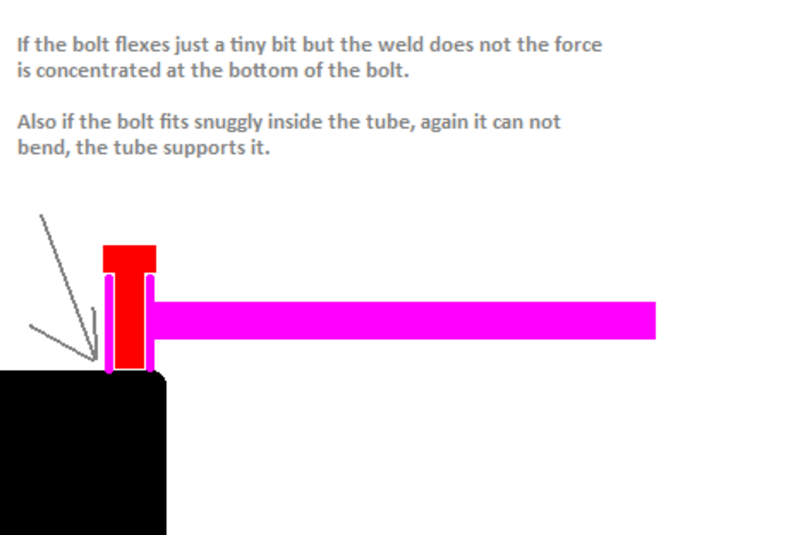 If the welds dont bend the bolts cannot? What? Bolts are made to be loaded by tension.. not by a twisting motion