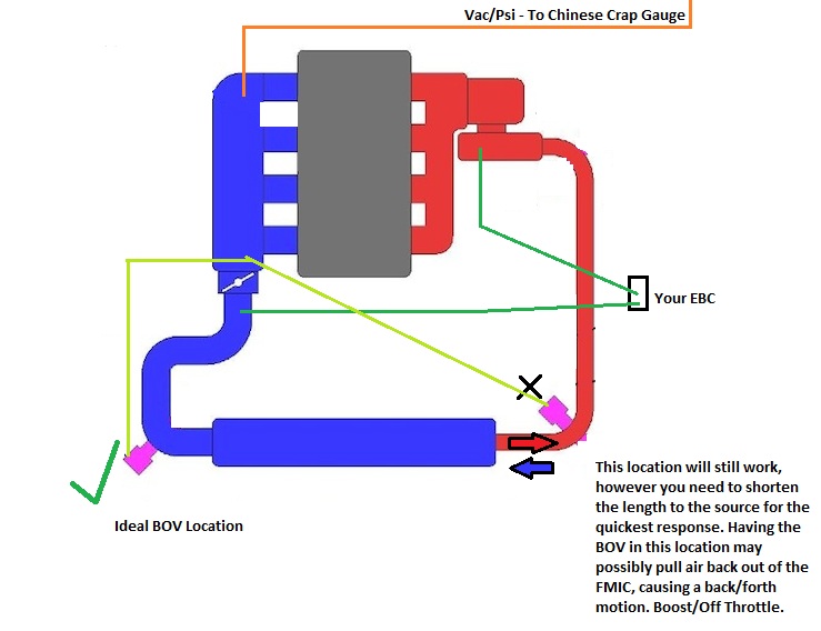 Point being, EBC or not... It should not have to be used to band-aid low boost response. As "B" being a prime location, the turbo will have the quickest spool up to the given pressure (say 6psi @ wastegate). And EBC is only a controller to increase that boost level. (Same low end response, higher psi output till it lets off and cracks open the wastegate)
