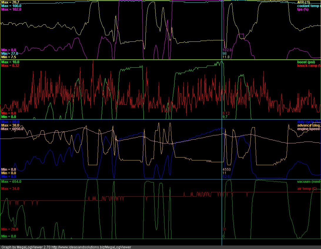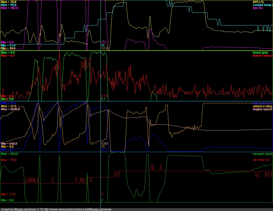 Ok- the important numbers there are the rise from the start of the boosted run (34c?) to the 36c at the end. That looks like a good intercooler setup to me. And I agree with Chad- that grill is probably blocking more air flow than you think.