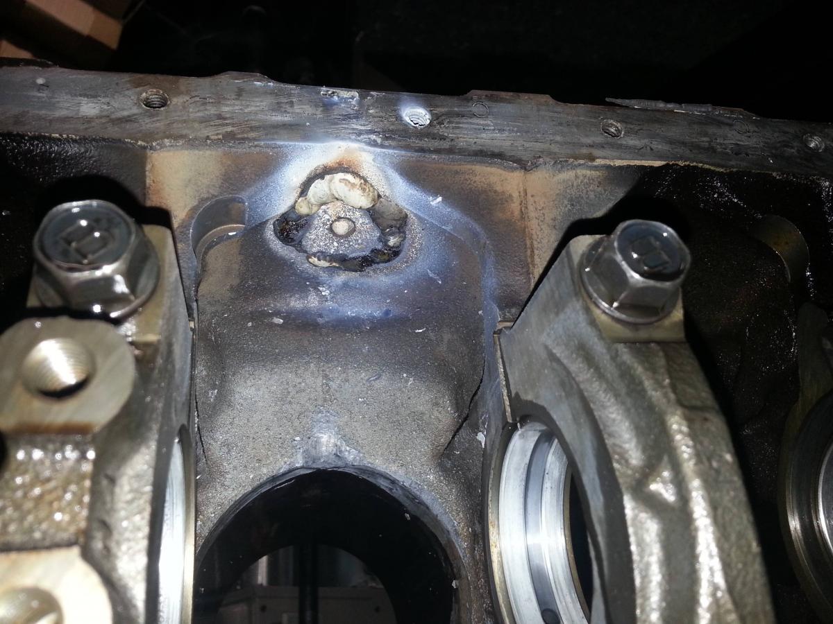 Will post pictures later, going to tell a quick story and take a shower & head out for the evening. Tore the block completely down and ran over to my brothers where we welded that perfectly round hole shut using a "plug" I cut with a hole saw out of another blown block using nickle rods on an old Lincoln stick welder. After we finished that up I found a huge crack in the block in the other side around the number 1 crank journal, so I drilled the crack ends and jbwelded it up. Ran a ball hone through the cylinders, took a burr to the crank and cleaned up all the sharp edges, power washed everything and stuck the crank in. Measured the main bearings, they all checked out in spec.