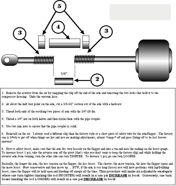 That wastegate actuator is adjustable and it came off of a 1980 Pontiac Sunbird turbo. The stock SR20 actuator I think mounts on the outside of the compressor, not the inside like I mounted mine. It is non adjustable, pre-set to 7psi I believe, and has a longer rod. You can easily fabricate a mounting bracket and if the actuator rod is too long, just cut it in 1/2, cut it down until it fits, and weld it back together.