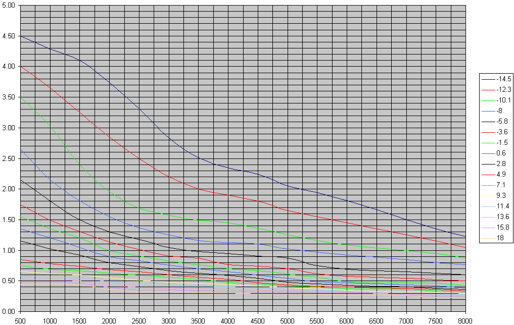 Here is what it looks like with a TD04H-15G turbo on an otherwise stock 1.6 engine (mine, to be precise). Each line is a different manifold pressure (expressed in relative PSI, where negative numbers are vacuum), the X axis is RPM, and the Y axis is sensor output voltage (remember that voltage decreases as airflow increases; 5v is fully closed, 0v is fully open):