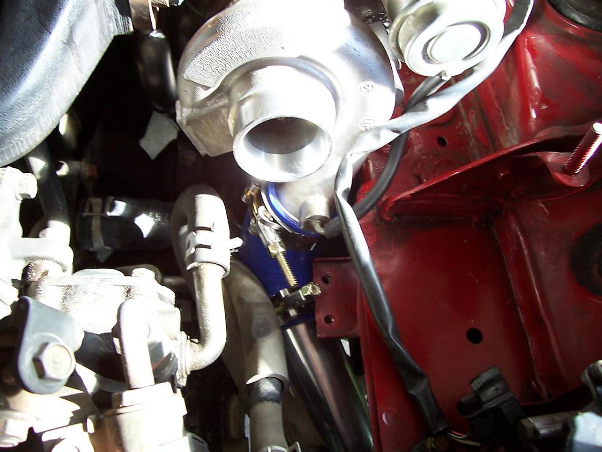 yes a picture would really help a lot in seeing how you've clocked the turbo. The other question I had was, the coolant lines on the turbo seem to be too big for the lines in the car. What did you use for those?