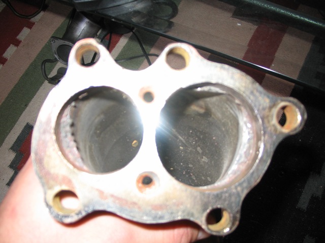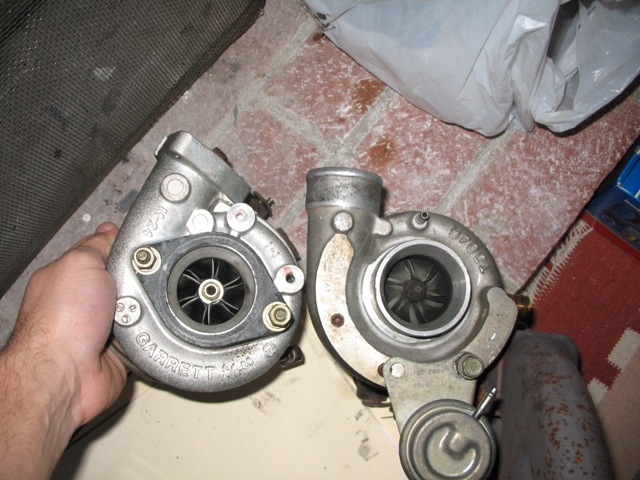 Well yesterday I attempted to clock the turbo, which was a complete waste of time. After hitting the turbo with a hammer, quite hard, I gave up and will take it to a shop. Either way I got some pictures to add to the thread. One pic is a t-25 (left) next to the greddy 15g (right). The other is showing the initial porting I just finished on my downpipe, you can compare it to braineack's pic above of before the porting. Still need to clean out a bit more.