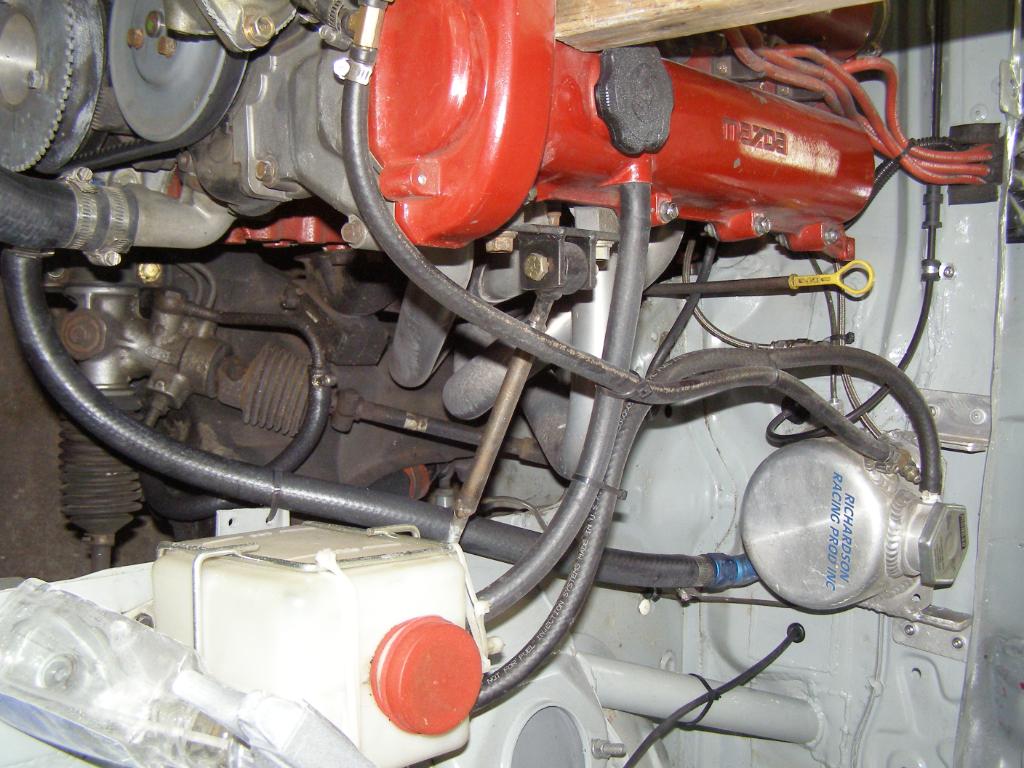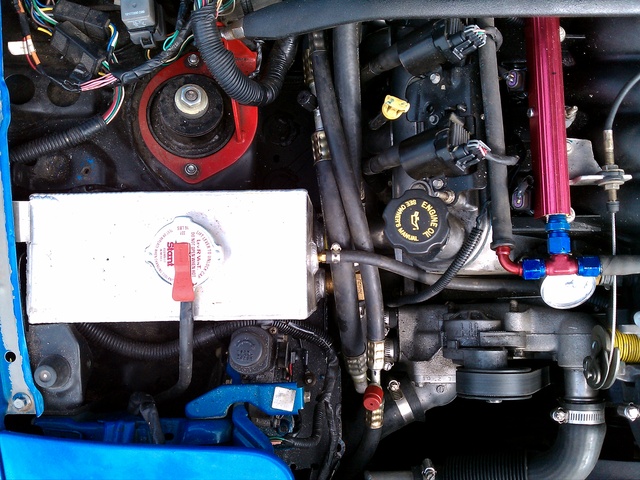 You can't see the swirl pot in Matt's old car unless you pull the intake plenum. His swirl tank only swirled water, with a bleed valve in the top to dump air. The header tank is visible in the pictures above. AWR sells both of these and they are very nice, I considered their swirl pot but don't "need" it.