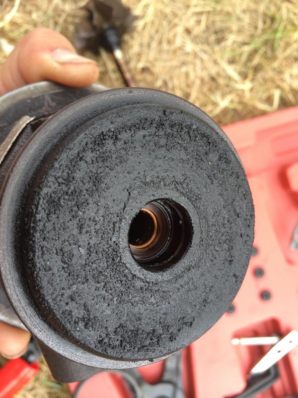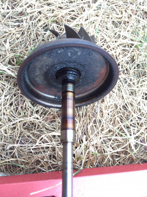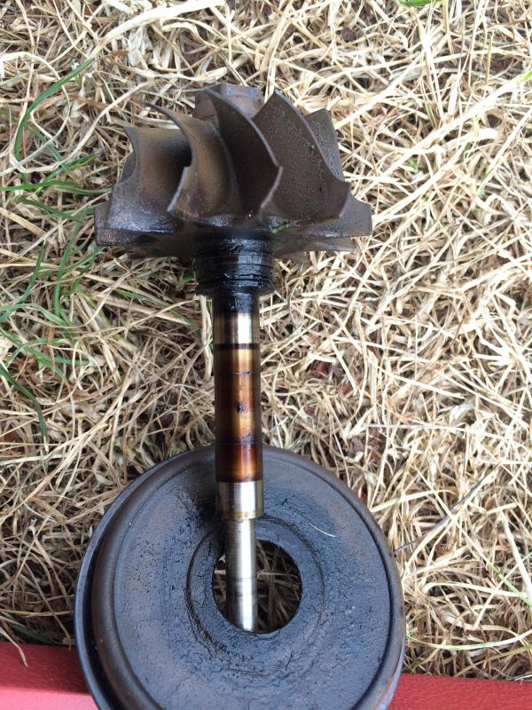 Check for turbine housing cracks. Decoke the cartridge & housing then polish the shaft and rebuild. I hope you marked the shaft to nut and compressor wheel