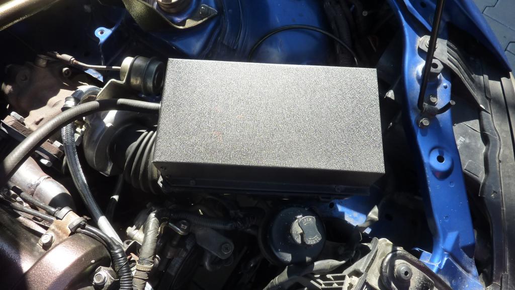 I got tired of looking an my old pod filter and decided to fit back the stock air box and filter. I turned it upside down and bolted it to the chassis.
