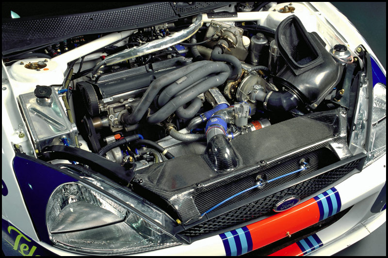 According to the specs it is a WRC focus and the turbo is a TR30R or a custom IHI unit. I’m guessing that is an IHI unit. Note also it has to suck through a restrictor. This is very bad for turbo reliability because the pressure ratio is increased dramatically for a given boost ratio.