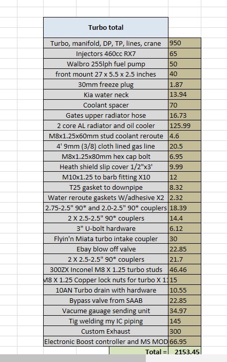Hi all, I've been putting together my plans for boosting my 1990 Miata. All of my information has been gathered from this forum (much thanks to Braineack's excellent diy faq), and Corky's book, Maximum Boost. My goals are to have a car that can be comfortably daily driven, so I'd like to make around 200 hp. I put together a price sheet to track what I'll need, and I hope I've been pretty realistic. I went overboard on a few things, such as injectors, in case I want to make more horsepower later on. I also know I'll need a Torsen, and that'll just be predicated on when a good deal comes up on Craigslist or on a forum. Stage one of my build is just to learn to tune. Install MS and drive around with it long enough to get comfortable with using TunerStudio to accomplish my goals. The parts listed in that section (intake piping and whatnot) are specifically to replace my AFM while still being able to use my Jackson Racing intake. After I feel good using MS, it's on to stage two, where the fun really happens.