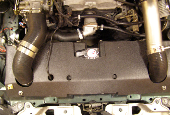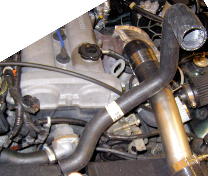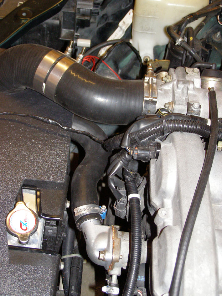 So recently I upgraded my radiator to one with a 2" core, up from the stock unit. Because of the added thickness of the core, and mostly because of my tilted radiator mounting scheme for the over the top IC piping, the stock hose would not fit properly. The radiator inlet connection was too close (from front to back) to the thermostat housing connection point. The radiator is tilted back at the top about 5" from the stock location.