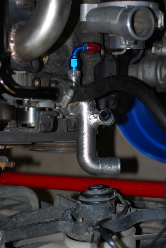 I'm using the stock one flipped around too. I'm just running a stock automatic radiator and fans and it fits fine. That black hose now connects to a -10 push lock thats threaded on that fitting pointing up. The heater core line is a custom hard line that runs above the turbo manifold to another push lock on the other side near the firewall.