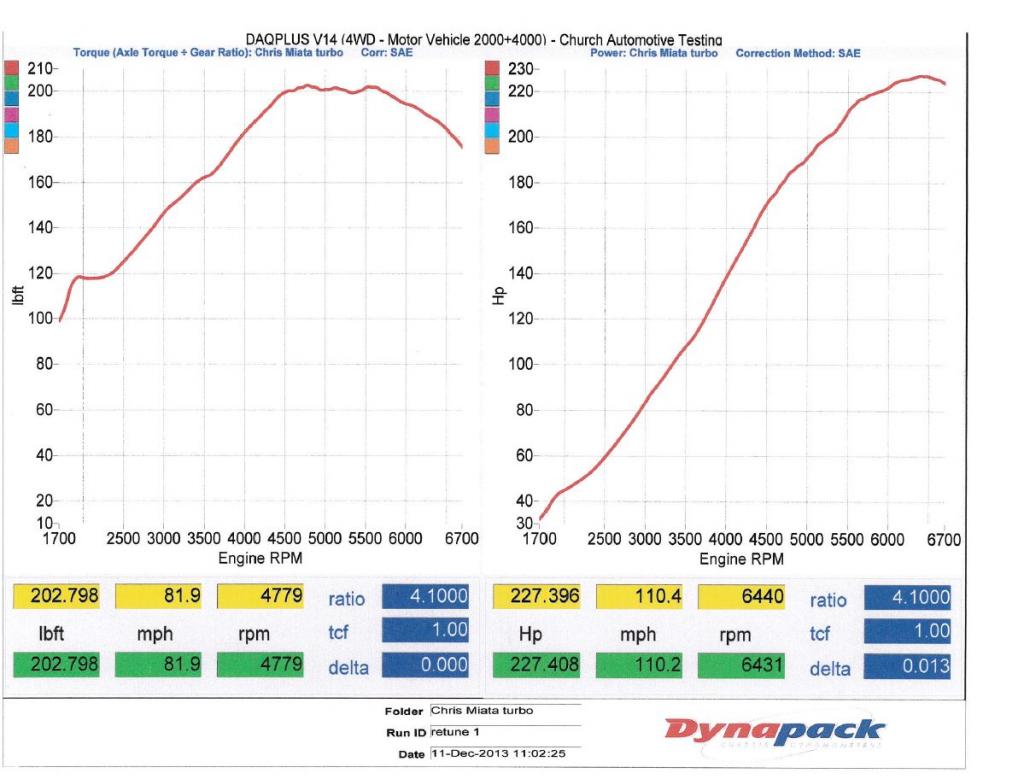 I got my car tuned last Friday at Church Automotive in LA last weekend. I am very pleased with the power it put down. I asked him to tune it to 230 ft-lb of torque (which ended up being at 14psi). Then set the EBC to 8psi for now which still makes great power.