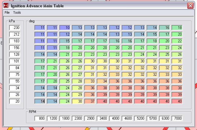 It is a very aggressive table, created from many hours on the dyno. I post it for reference only and in no way advise anyone to copy it. If you simply slap my table into your ECU, you may possibly destroy your motor. I would suggest the MSPNP basemap's ignition table as a better starting point.