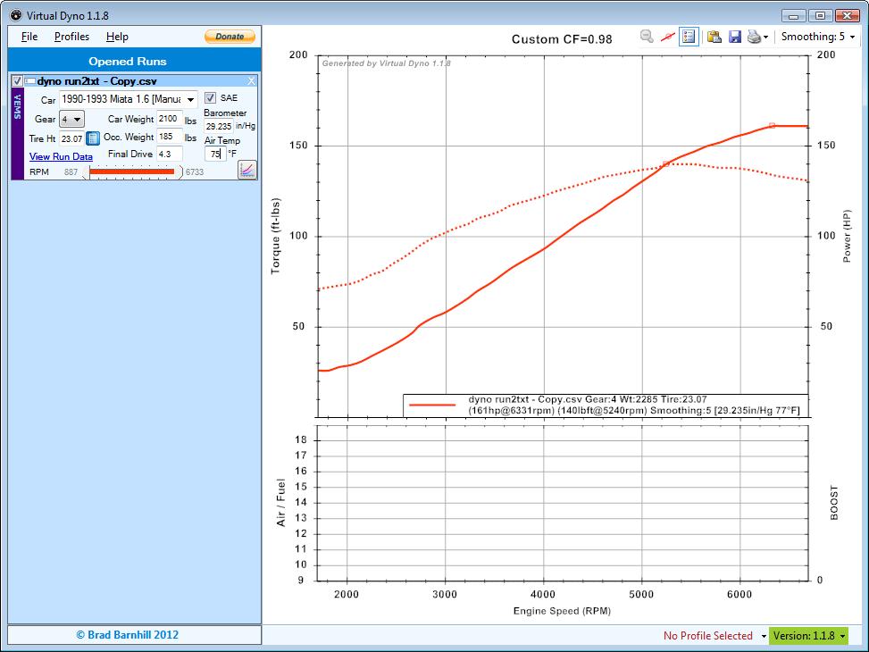 Virtual Dyno got it pretty damn close! 5hp high and 8ft/lbs low. That's with a weight, as you can see, of 2100lbs, which is a very rough estimate. If I put in 2000lbs it gets the hp dead on, I doubt with my stock seats, roll bar, and turbo setup I'm that light.