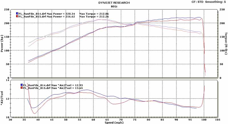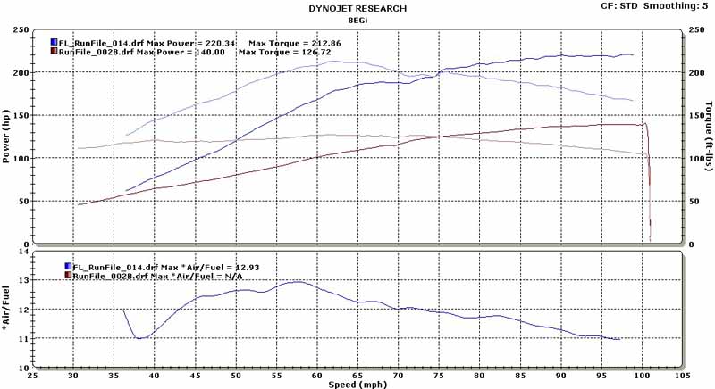 Tuning was done at Fastlane in Houston, TX. The car started off making 188 whp @ 6 psi. After tuning was done, the final result was 220 whp & 212 ft-lbs torque @ 8 psi. I was quite surprised at the response of this system. I would have expected some lag, partly due to the three catalytic converters on the car. But there really was not any. It's response was just as good (if not better) than any other Miata I have tuned. It was quite fun to drive.