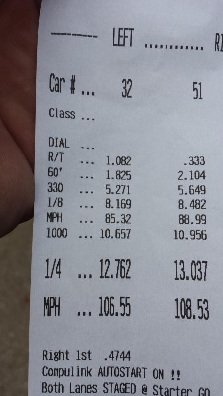 Damn, your MPH is almost identical to mine... on my 13.5 second run. I need a good clutch so bad it is killing me! I can't launch at anything over around 2000 RPM or I get clutch slip, so I have horrible 60' times.