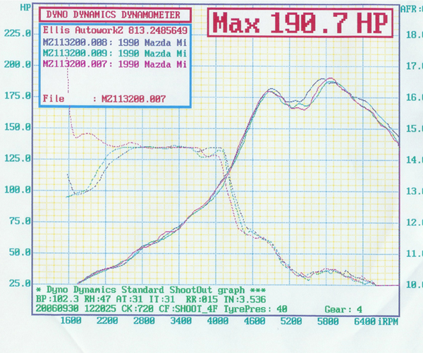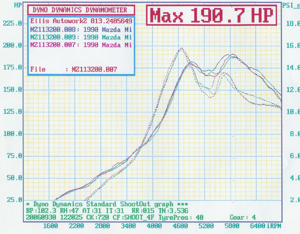 We had a club dyno day in Tampa this past weekend and had 9 turbo and supercharged Miatas on the rollers. I had the highest numbers (by a couple of hp), but ran into a consistent problem. I would peak at 16 lbs of boost @ 4600 RPM, then it would drop to 12 lbs and creep up to 13.5 lbs. It appears that either the MBC or wastegate is causing the drop. I am adding a helper spring to the wastegate sometime this week to see if that will resolve the issue. Here's a question: How much tension should the spring provide?