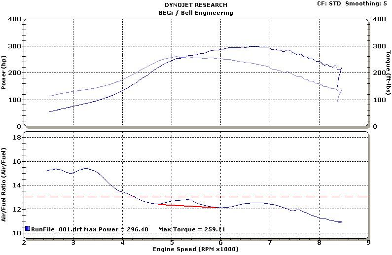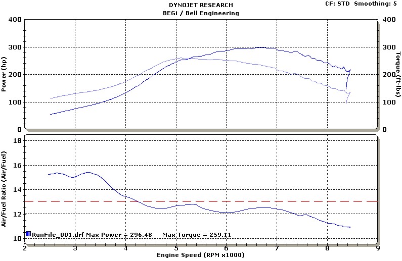 Here is the dyno chart... Feel free to discuss. Numbers are uncorrected. Corrected numbers would have been around 310 RWHP and 277 ft/lbs of torque. I had another run with 264 ft/lbs and 296 RWHP, this was the backup run with 259 Torque 296 RWHP.