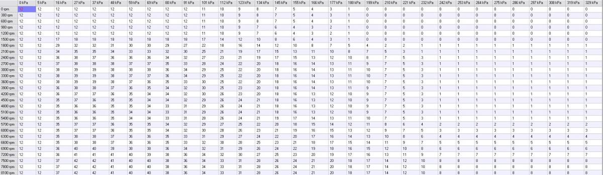 Look at the .msq I sent you and raise those values way up. "Treycops3.msq" has each cell set at MBT with 93 octane in an 8.6:1, 1.9l and you can compare the CLT and IAT values from the log. I think you can run at least 20* advance at 15psi considering your turbine is bigger than mine.
