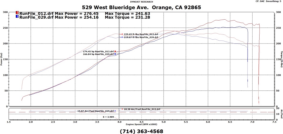 I'd have to really scrutinize the logs to look into that, as far as those specific pulls, AFR was very very similar because those were the final pulls after the tuning was finished. (11.6-11.8?)
