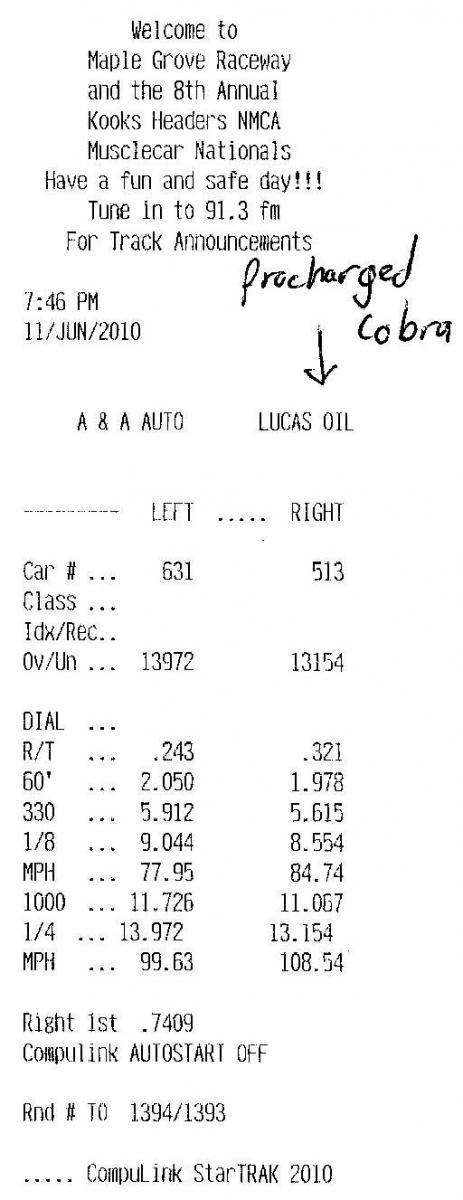 I finally got around to posting this on youtube. At the end of the video the announcer says what sounds like 13.06 and 14.70? I'm not sure what he was smoking, because when I came around to get my timeslip, the dude in the booth told me if I wanted to run again I'd need a helmet. I think you need a helmet for a convertible if you run 13.99 or quicker.