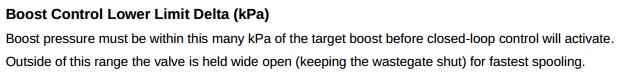 What you are saying in effect is, start trying to use closed loop boost control until I get within 80kpa of my target. If you are at 100% throttle and your target is 200, it is going to be doing math once it crosses 120kpa. The way I understand it, is you should keep the delta as low as possible so it keeps your wastegate closed as long as possible. Try putting 30kpa in that and see how it goes. If it overshoots, raise it. If it is slower to build boost but doesn't overshoot, lower it.