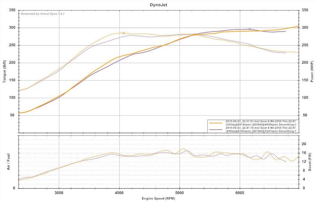 As you can see 15psi, stock everthing, comparable low end and the turbo is clearly not struggling.