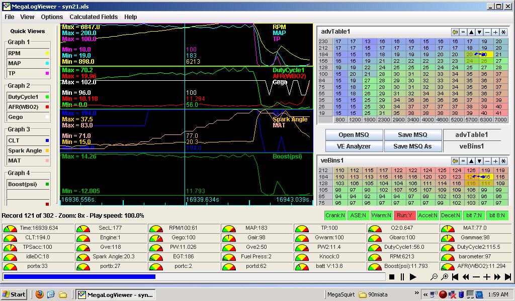 For whatever it's worth, this screenshot of a log from a dyno pull shows the VE table. And yes, sunshine, it is on E85, or whatever the pumps put out now which is probably more like E70. This pull was probably around 287 whp on a dynapack, but without plots