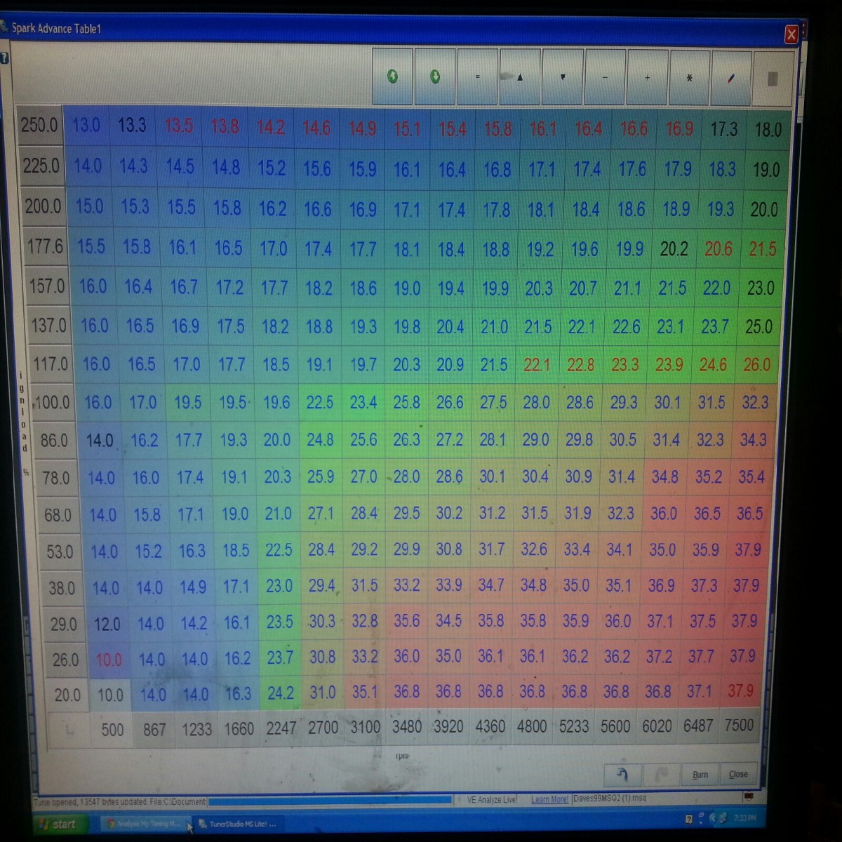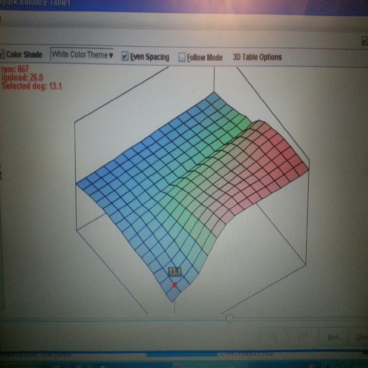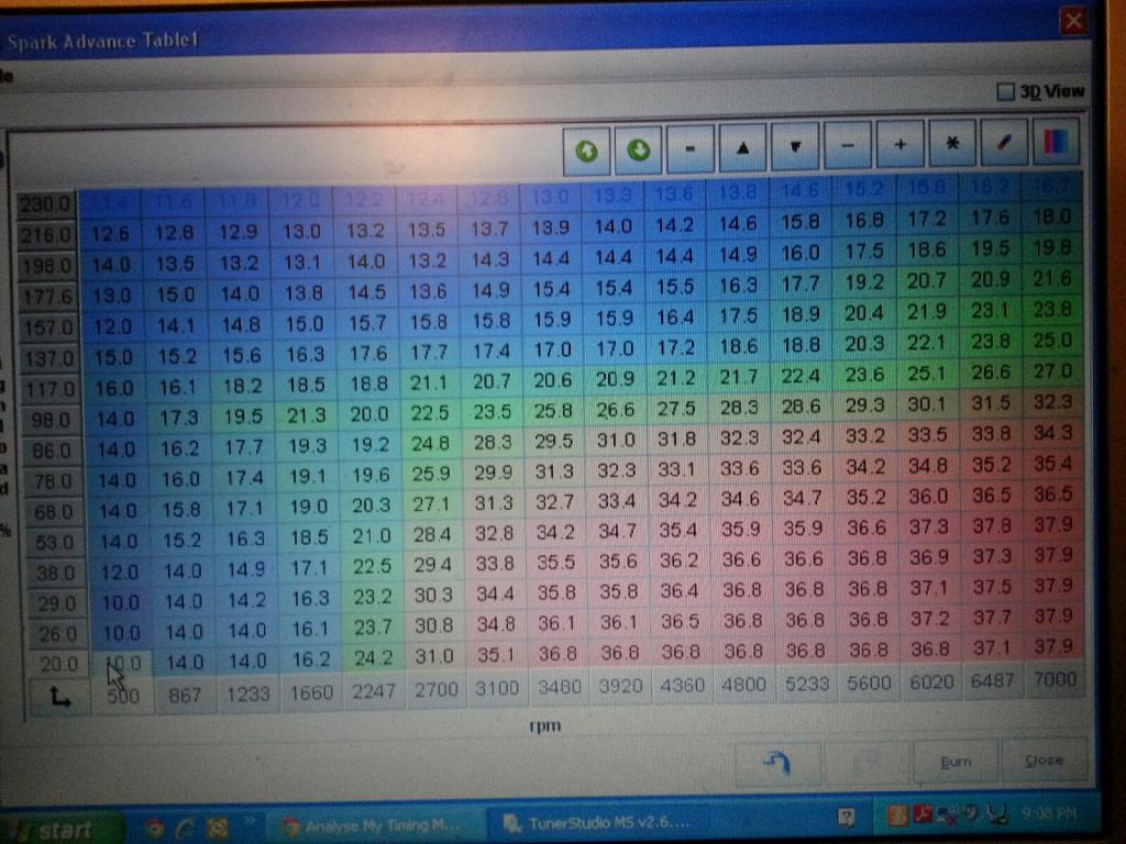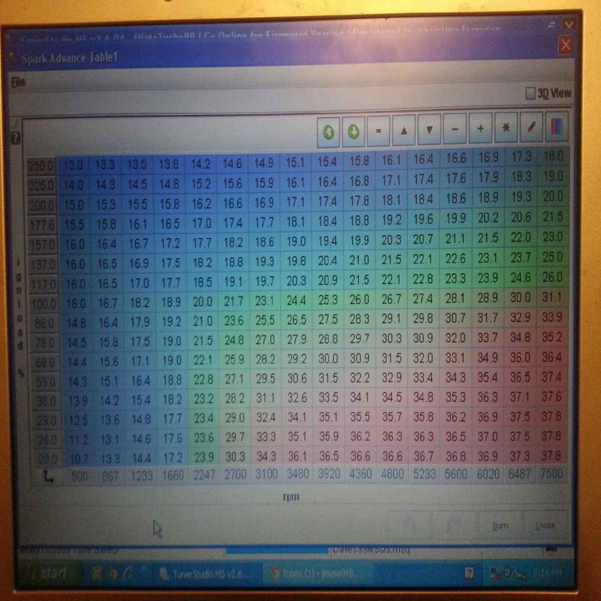 Okay, Engine is definitely not happy with this map. I heard Detonation in the higher Rpms in boost. Couldn't really tell while driving were in the map it was occurring, but it looked like it was coming from the 177kpa area around 4k +. I started dialing the entire boosted section of the map down .5 degrees increments at a time. I did stop hearing it till i backed it out 1.5 degrees. I need to get some DET cans.