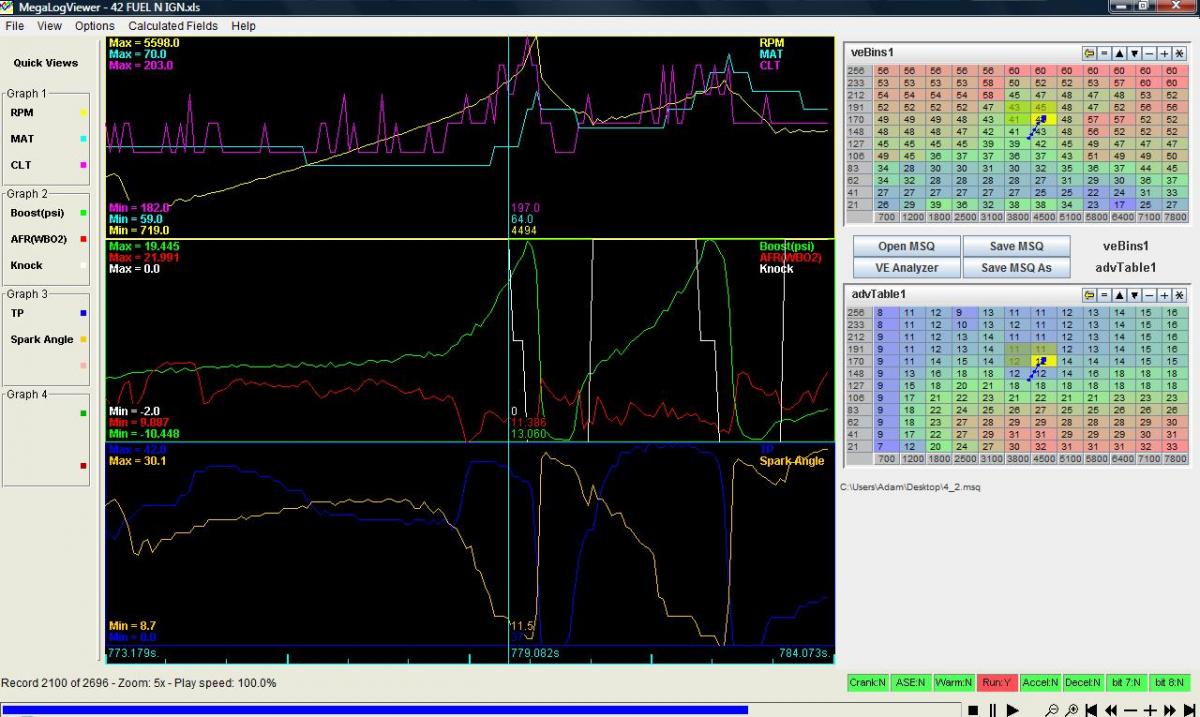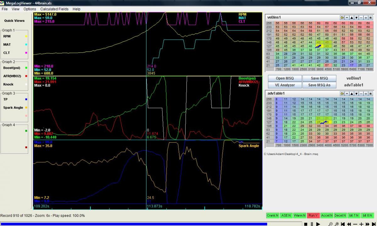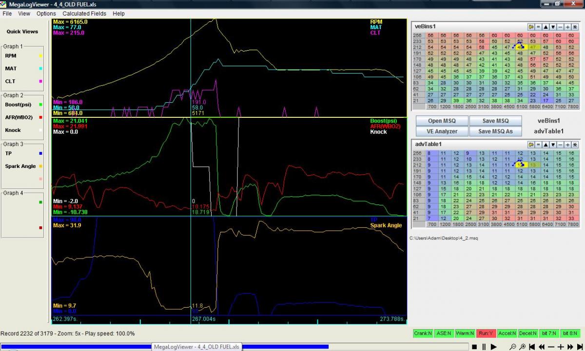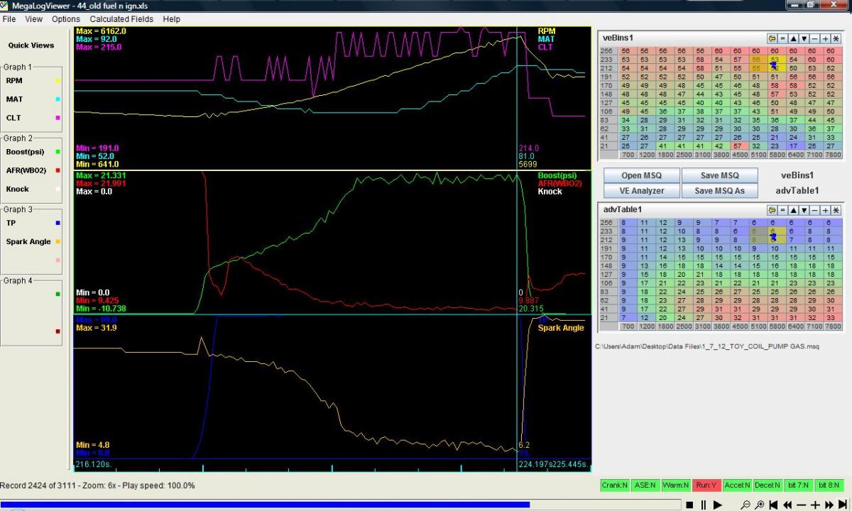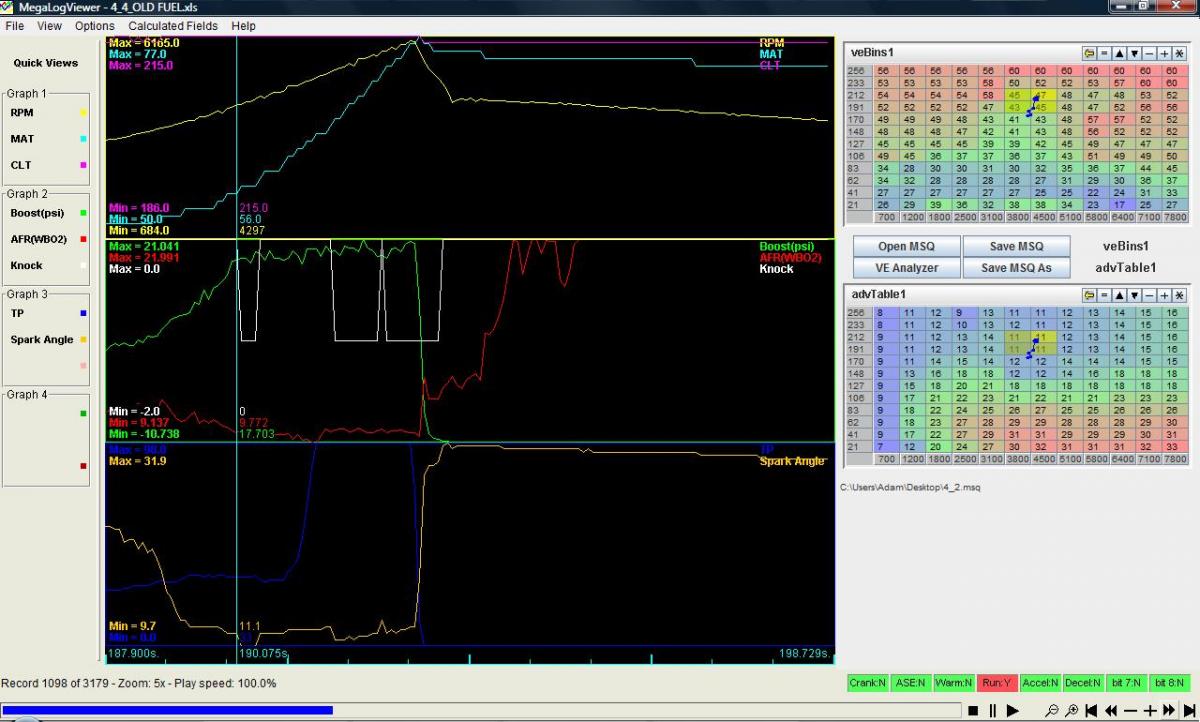 Tonight I did back to back runs, on the same strip of road, and the results are to follow. I left KnocksenseMS on so you could see where it knocked. MS pulls 1 deg of timing for every sec of knock. Note that KnocksenseMS is triggered by my TurboX RFL blow off valve, which is noted in MegaLog Viewer when the TPS goes from 99 to 0 rapidly.