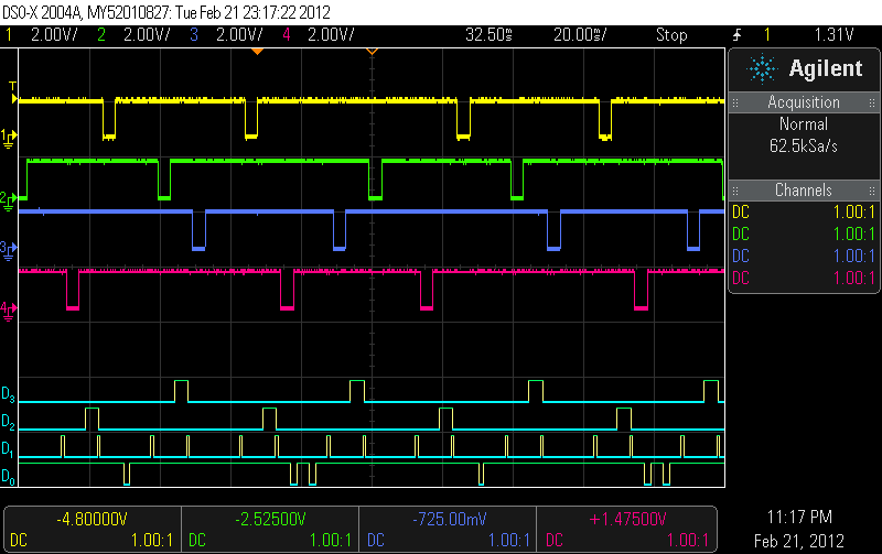 Also, just out of curiosity, was that taken from an actual running engine? Those injector pulses look abnormally clean, and the duty cycle seems way too high for idle (6.85% based on 11 pixels/squirt x2 squirts across a 321 pixel cycle.)