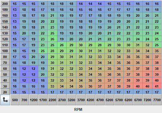 Remember you'll generally be cranking below 500rpm, and at 100kpa, so everything is based off the 500rpm/100kpa cell. So in your case your ve is 58, timing is 18 degrees.