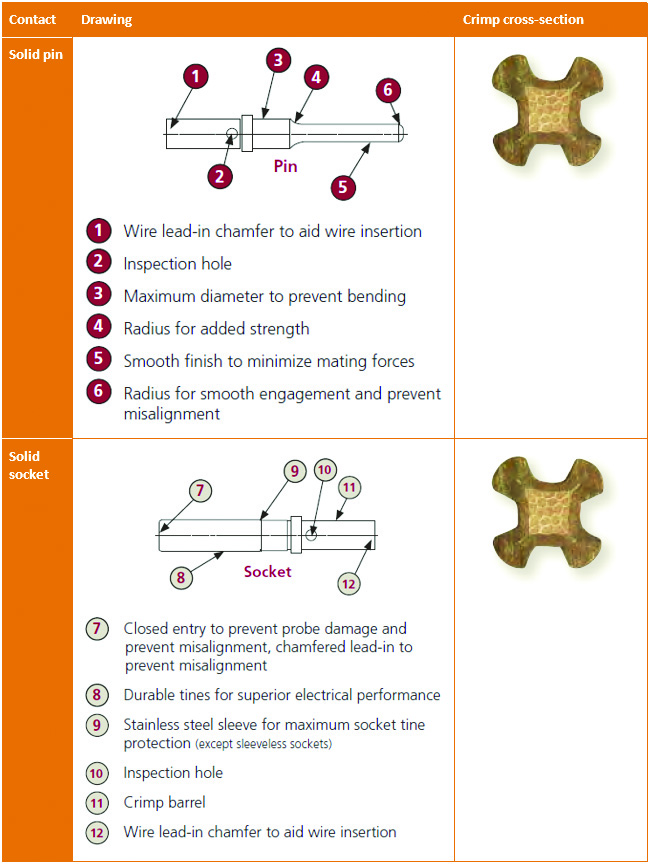 On to contacts, I like Deutsch because they use "solid" contacts, which means the whole contact encapsulates the wire and the crimper "pinches" the wire. See this: