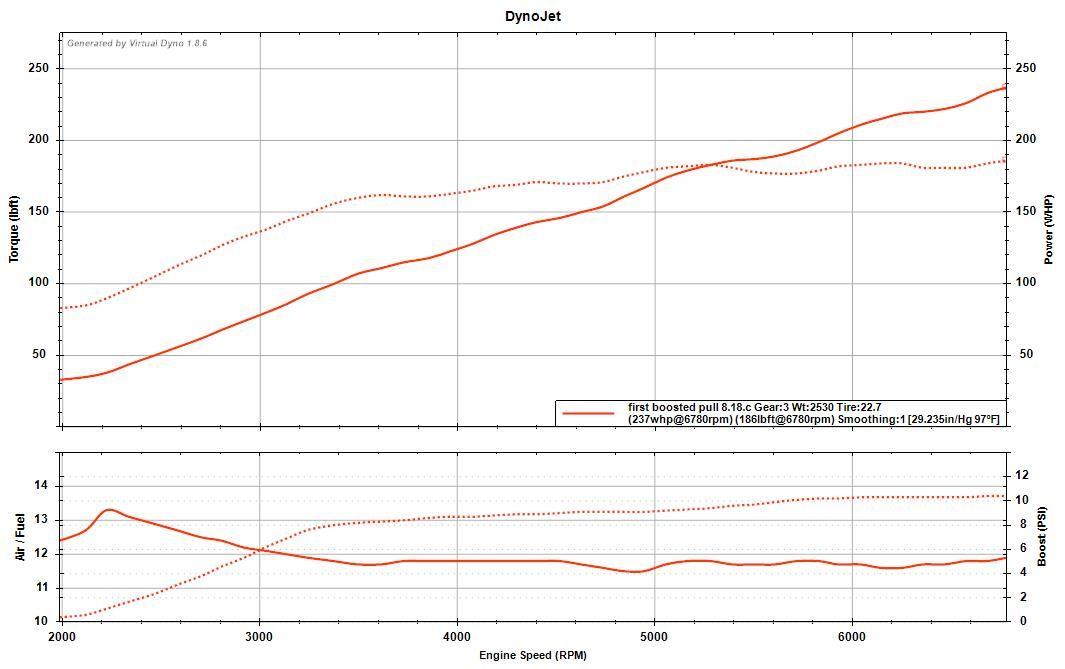 She's a ripper! This is with STUPID conservative timing to try and keep the boost down. I ported, ported, and ported some more on that turbine housing, but the effciency of the GBC is reeeeeediculous. I'll get a cat installed and dial in some settings, but for now I'm quite pleased with the results. Tune attached, open for comments and opinons!