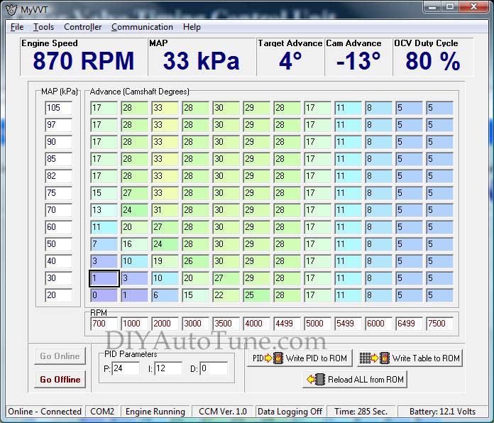 Anyway, the problem appears to be that the VVTuner is commanding full advance all the time; PM me to troubleshoot this through email.