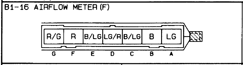 IAT(2P), AFM(2O), signal gnd, +5V(2K), signal gnd, power ground, and fuel pump.
