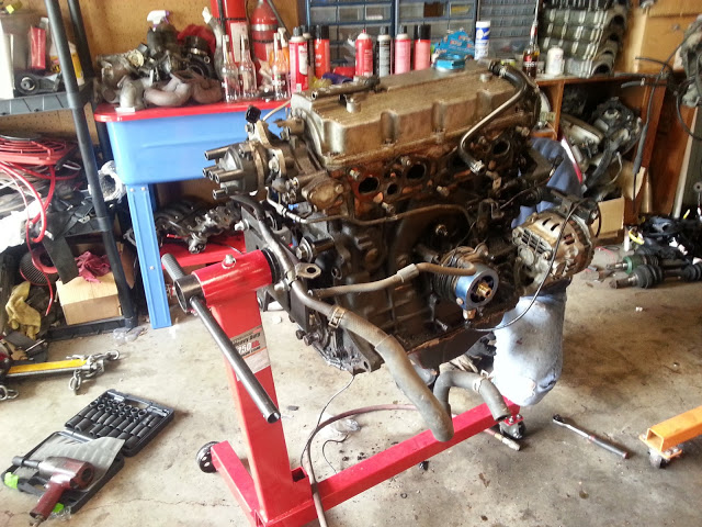 As for the turbo manifolds... the shiny one is going on this motor. The tubular thingy majigger is a top mount RWD F2T manifold, "goes with" the flipped intake manifold on the bottom shelf of the parts washer.